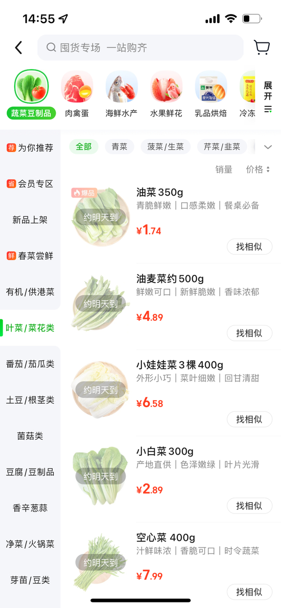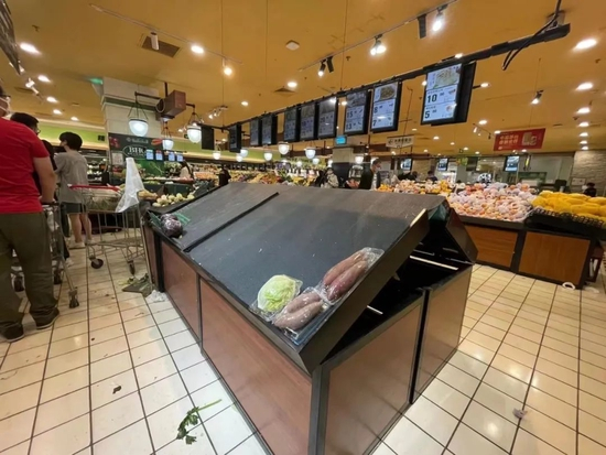 然而当她点开各类抢菜软件,却看到平台提示:当前订单激增,送达可能延迟。无奈之下,她立即跑到公司楼下一家超市采购,所幸货物还是很充足的,想要的物品也都“囤”到了。