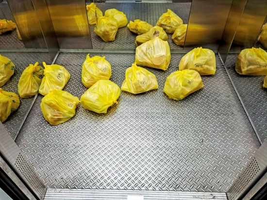 胡冬安和志愿者把团购来的物资标好号码,按顺序排放,利用电梯传送,订了货的居民自己按好楼层到电梯里自取,避免接触。图/受访者提供