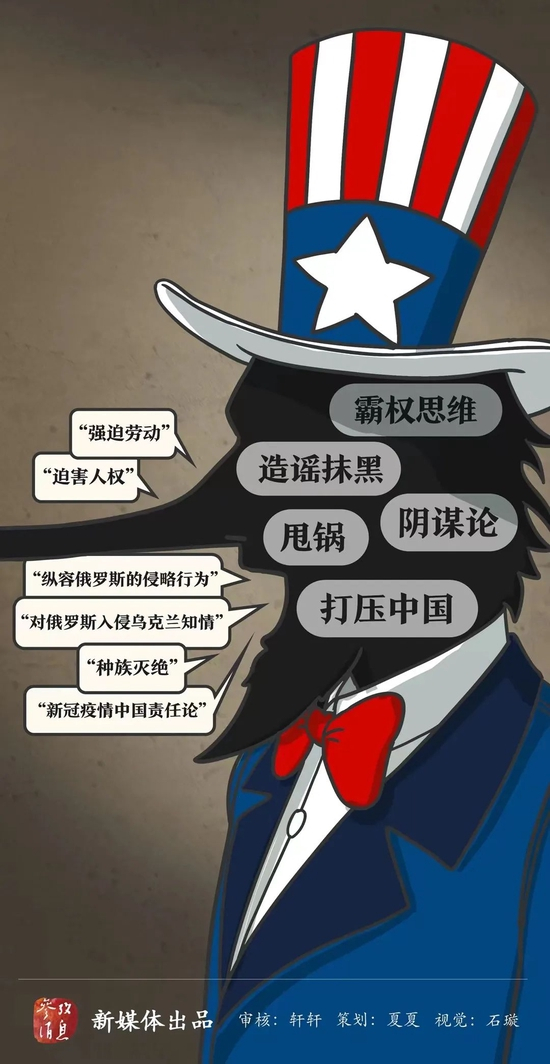 在涉疆问题上,美国更是精心设置议题,从“迫害人权”到“强迫劳动”再到“种族灭绝”,罪名花样百出。先是美国非政府组织撰写所谓涉疆“报告”,抛出话题,接着美国及盟国媒体大肆炒作。舆论造势后,美国政客炮制各种涉疆法案,美国政府更以存在所谓“强迫劳动”为由,推出禁止新疆地区所产棉花制成的部分或全部产品的“暂扣令”。整个操作可谓环环紧扣、行云流水。