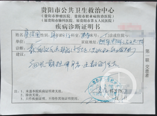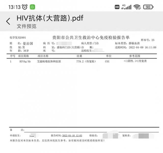 4月8日和9日,连着两天的检测报告显示,晏治国的抗体和抗原数都超过了700。在贵阳市公共卫生救治中心的疾病诊断证明书上,医生写道:获得性免疫缺陷综合征(艾滋病病毒感染),需长期规律用药,定期进行复查。