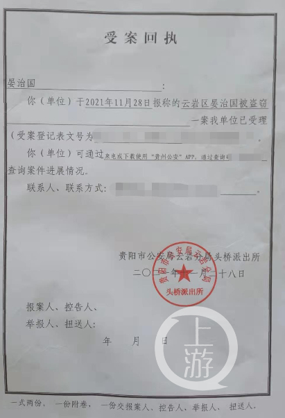 一份晏先生提供的受案回执显示,贵阳市公安局云岩分局头桥派出所民警受理了此案。