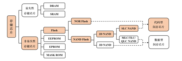 在集成电路领域中,根据产品的功能与结构不同,一般可分为数字芯片、 模拟芯片和存储芯片三大类型,其中数字芯片与模拟芯片的功能以运算及处理各类信息为主,存储芯片的功能以存储信息为主。存储芯片的分类示意图如下: