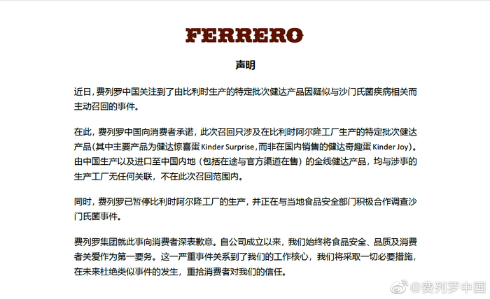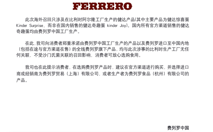 4月9日,费列罗中国微博发布声明回应费列罗巧克力涉嫌沙门氏菌感染:费列罗中国向消费者承诺,由中国生产以及进口至中国内地(包括在途与官方渠道在售)的全线健达产品,均与涉事的比利时生产工厂无任何关联,不在此次召回范围内。