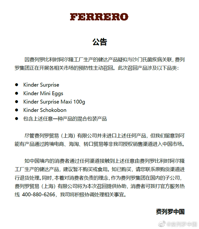 4月14日,费列罗中国微博发布消息称,针对疑似与沙门氏菌疾病关联的比利时产的健达产品,费列罗集团目前正在相关市场开展预防性主动召回。费列罗中国留意到部分产品可能通过跨境电商、海淘、转口贸易等非我司授权销售渠道进入中国市场。本着对消费者负责的理念,我司将对该部分产品的召回提供协助。
