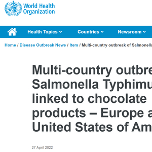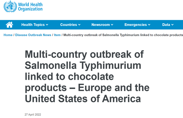 据世卫组织统计,截至4月25日,已有比利时、法国、德国、爱尔兰、卢森堡、荷兰、挪威、西班牙、瑞典、英国和美国共11个国家报告了151例疑似与食用受污染巧克力产品有关的沙门氏菌感染病例。感染者中有89%为10岁以下儿童,至少9名感染者住院。
