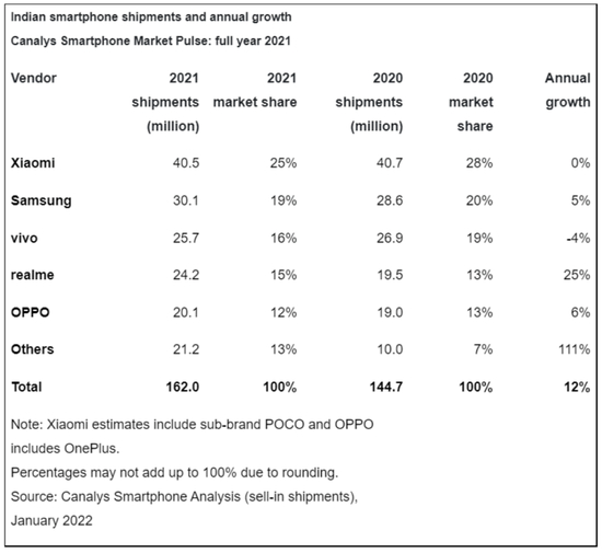 根据今年年初,数据公司Canalys公布的2021年印度智能手机市场销量排行榜,小米位居第一,蝉联了销量冠军。而在其身后,分别是三星、vivo、realme和OPPO。