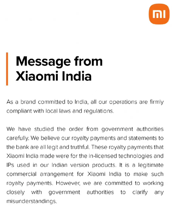 事发第二天,小米集团作出紧急回应称,公司所有运营活动都严格遵守当地的法律法规。小米印度向银行支付的特许权使用费和账单合法且真实,所支付版税均用于公司印度版本产品所使用的授权技术和知识产权,是合法的商业行为。