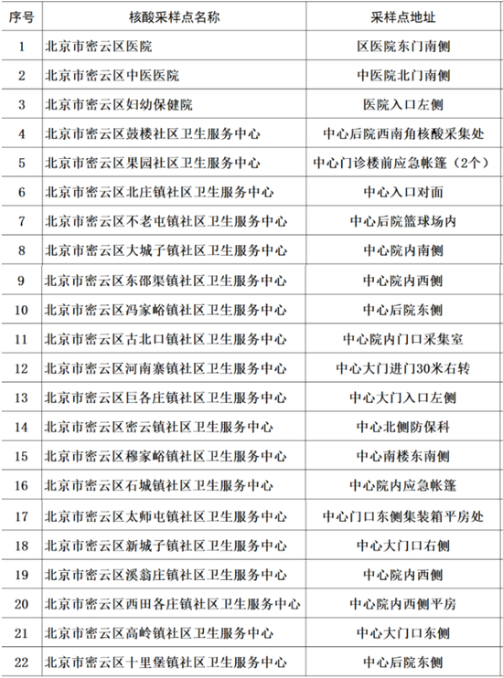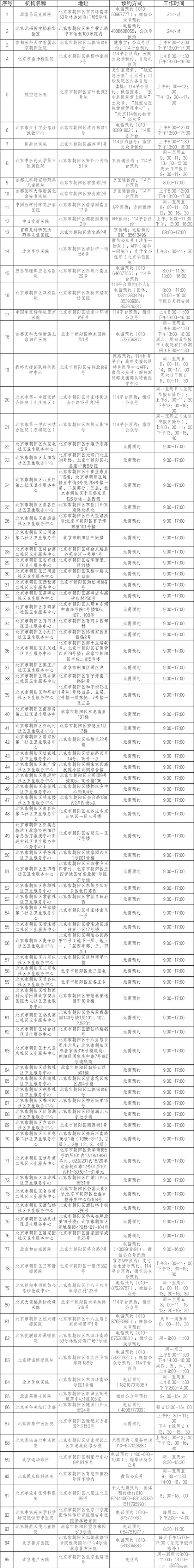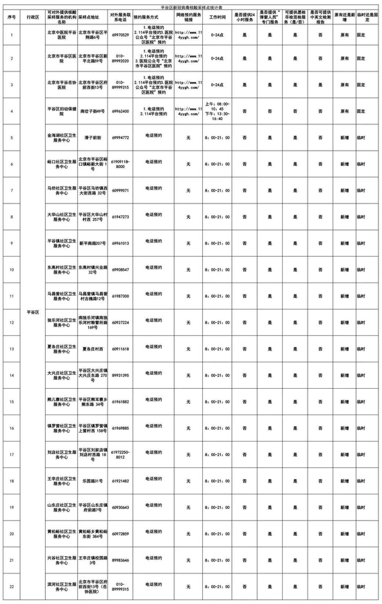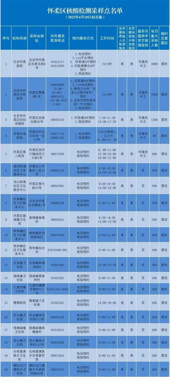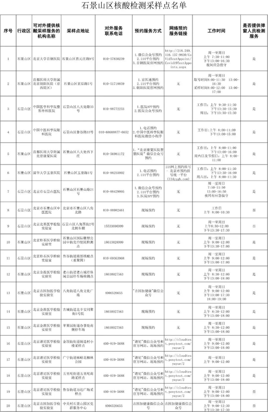 截至目前,朝阳区、门头沟区、密云区、平谷区、怀柔区、石景山区等,已公布常态化、固定核酸检测点位,以及各点位地址、工作时间、联系电话和预约方式。