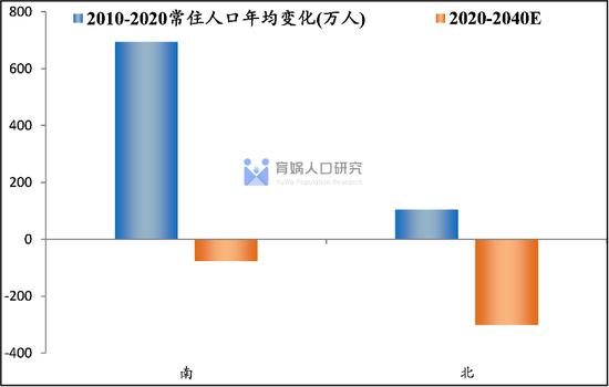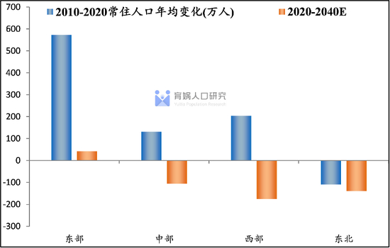 分南北看,未来南北人口数量差距进一步扩大,随着总人口进入负增长阶段,南北人口均有收缩,但南方收缩规模明显小于北方,预计2020-2040年南、北常住人口年均增量分别为-76.7万、-301.5万人;分四大地区看,人口继续向东部集聚,预计2020-2040年东、中、西、东北部常住人口年均增量分别为41.8万、-105.8万、-175.3万、-138.9万人。分南北看,2020年南、北方经济-人口比值分别为1.09、0.87,北方有人口流出倾向。根据预测,2020-2040年南、北方常住人口年均增量分别为-76.7万、-301.5万人,南北方人口均减少,但南方减少规模明显小于北方,2020、2040年南、北方人口占比分别由59.3%、40.7%变为61.5%、38.5%,南、北方人口占比差距进一步扩大。分四大地区看,2020年东、中、西、东北地区经济-人口比值分别为1.3、0.8、0.8、0.7,除东部地区外,其他区域均小于1,未来有人口流出倾向。根据预测,2020-2040年东、中、西、东北地区常住人口年均增量分别为41.8万、-105.8万、-175.3万、-138.9万人,预计2040年东、中、西、东北地区人口占比分别为 42.8%、25.7%、26.1%、5.4%,占比变动分别为2.9、-0.1、-1.1、-1.7个百分点,东部人口占比持续上升、东北人口占比继续下降。
