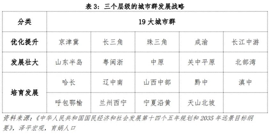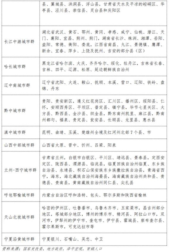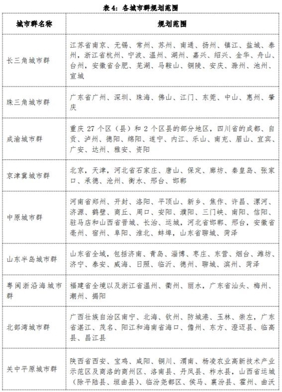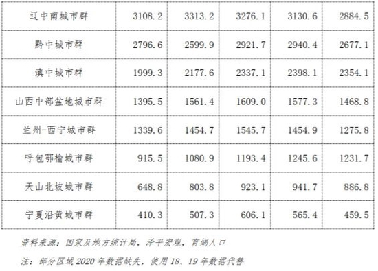 2014年《国家新型城镇化规划(2014-2020年)》及“十三五”规划要求建设长三角、珠三角、京津冀、山东半岛、海峡西岸、哈长、辽中南、中原、长江中游、成渝、关中平原、北部湾、山西中部、呼包鄂榆、黔中、滇中、兰州-西宁、宁夏沿黄、天山北坡共19个城市群。“十四五”规划提出优化提升京津冀、长三角、珠三角、成渝、长江中游五大城市群,发展壮大山东半岛、粤闽浙沿海、中原、关中平原、北部湾等城市群,培育发展哈长、辽中南、山西中部、黔中、滇中、呼包鄂榆、兰州-西宁、宁夏沿黄、天山北坡等城市群。按照2020年常住人口排序,前十大城市群为“十四五”规划纲要提出要优化提升的五个城市群和发展壮大的五个城市群。需要注意的是,部分城市群县级单位数据缺失,多用地级市全域近似替代。