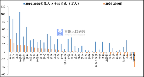 未来中国人口继续向核心城市集聚,预计2020-2040年深圳、成都、合肥常住人口年均增量超18万。从经济-人口比值看,除资源型城市外,2020年经济-人口比值前五分别为无锡、北京、南京、苏州、深圳,均大于2,未来人口有流入趋势。从常住人口变化看,预计2020-2040年常住人口年均增量前五的城市分别为深圳、成都、合肥、广州、杭州,增量分别为26.2万、19.0万、18.8万、17.8万、14.2万人,均为都市圈的核心城市。
