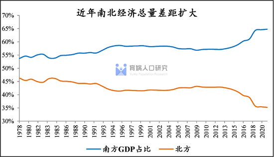 人口流动的区域差异主要因为地理环境、产业发展差异及区域经济社会发展的不平衡。从地理环境看,改革开放前,中国处于计划经济时期,经济发展主要靠内循环,北方拥有丰富的煤炭、石油、铁矿资源等,铁路建设以货运为主,优势明显;而南方资源相对匮乏,东南沿海更处海防前线,重工业、大项目布局较少。改革开放后,中国逐渐向社会主义市场经济体制转型。改革开放要求融入全球化体系,东南沿海较北方沿海具有更便利的海运优势,并通过长江、珠江较易形成广阔市场和腹地;而黄河水量少、河道浅,通航能力差,在发展外向型经济时面临劣势。从产业发展看,北方依托资源优势形成以资源型和重化工业型为主的产业结构,但是因为沉重的计划经济包袱和资源逐渐枯竭,在1990年代开始衰落,并且在2008年金融危机后因市场机制改革滞后、营商环境较差,新动能培育缓慢,产业转型艰难;南方珠三角地区在改革开放初期利用毗邻港澳优势,大力发展加工制造业,并且在金融危机后,东南地区因日益发育的市场机制快速出清过剩产能,推动经济转型升级、发展高新产业,南方内陆省份依托长江等承接沿海产业。从经济发展看,1978-2012年南北经济份额分别从53.7%、46.3%变化至57.1%、42.9%,差距从7.5个百分点扩大至14.2个百分点。2013年后,南北经济差距迅速拉大,2020年经济份额差距增至29.6%,并且从2014年开始,北方人均GDP低于南方。