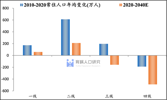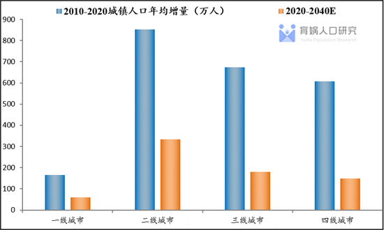 分线看,预计2020-2040年一二三四线城市城镇人口均有所增加,二线城市年均增速领先。从城镇化率看,2020年一二线城镇化率高于70%,三四线城镇化率分别为60.7%和52.4%。从城镇人口数量看,预计2020-2040年一、二、三、四线城市城镇人口年均增量分别为59.9万、361.9万、179.6万、149.3万人,分别为2010-2020年均增量的36%、44.7%、26.6%、24.6%,三四线城市人口增量下降明显。从增速看,预计2020-2040年一、二、三、四线城市城镇人口年均增速分别为0.7%、1.2%、0.7%、0.5%,二线城市城镇人口增速最快。