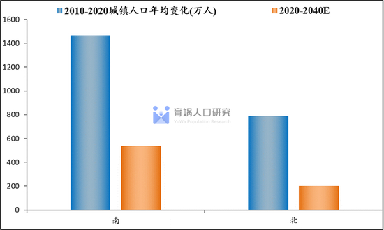分南北看,未来南北城镇人口数量差距扩大,预计2020-2040年南、北城镇人口年均增量分别为536.2万、202.1万人;分四大地区看,东部城镇人口持续集聚,随着城镇化进入稳定发展期,城镇人口增速略低于中西部,预计2020-2040年东、中、西、东北地区城镇人口年均增量分别为304.7万、221.4万、263.2万、-50.9万人。分南北看,2020年南北城镇化率分别为64.6%、61.6%,均处于城镇化快速发展的减速发展阶段,南方城镇化率略高于北方。根据预测,南方与北方城镇人口数量差距将扩大,预计2020-2040年南方、北方城镇人口年均增量分别为536.2万、202.1万人,南方城镇人口占比从60.3%提升至61.5%。分四大地区看,2020年东、中、西、东北地区城镇化率分别为70.9%、59.1%、55.7%、67.4%,其中东部地区城镇化进入稳定发展期,其余三区处于快速发展的减速发展阶段。根据预测,2020-2040年东、中、西、东北地区城镇人口年均增量分别为304.7万、221.4万、263.2万、-50.9万人,占比变动分别为-0.5、0.9、1.7、-2.1个百分点,东北地区受制于总人口下降,城镇人口也呈下降趋势。从增速看,2020-2040年东、中、西、东北地区城镇人口年均增速分别为0.7%、1.0%、1.1%、-0.8%,随着东部地区进入城镇化稳定发展期,城镇人口增速略低于中西部。
