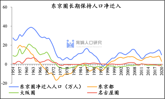 从国际经验看,人口向大都市区集聚。美国人口长期向大都市区集聚。1950-2019年美国都市区人口比重从56.1%增至86%;其中100万人以上都市区占比从29.5%增至56%;500万人以上都市区人口比重从12.2%增至24.7%,人口向大都市区集聚趋势明显。作为美国最大的都市区,纽约都市区土地面积为1.7万平方公里,2019年人口1922万人,占比5.8%,GDP1.9万亿美元,占比10.1%,经济-人口比值约1.74。在日本城市化进程中,人口随产业持续向大都市圈集聚,并且表现为从“三极”集聚向东京圈“一极”集聚。1973年东京圈、大阪圈、名古屋圈经济-人口比值分别为1.22、1.13、1.12,1974-2018年,东京圈、大阪圈、名古屋圈人口净迁入量分别为400.5、-92.7、8.7万人,经济-人口比值分别为1.17、0.9、1.15。