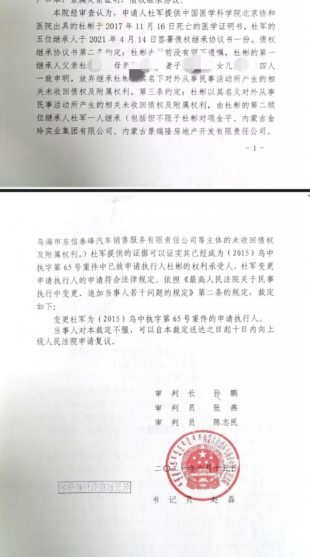 ▲乌海中院执行案件在2021年6月15日作出裁定:变更杜军为原杜彬申请人执行案件的执行申请人。图片来源/受访者供图