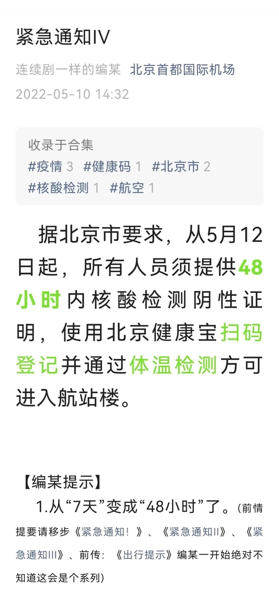 据北京市要求,从5月12日起,所有人员须提供48小时内核酸检测阴性证明,使用北京健康宝扫码登记并通过体温检测方可进入航站楼。