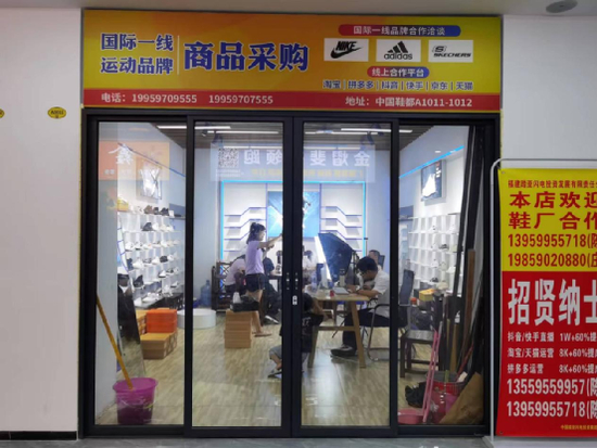 记者前往中国鞋都精品鞋商贸城的时候,晋江刚刚解封,鞋都内各家门店都在为重新开张做准备,复工复产颇为忙碌。与安福城一样,这里的各家门店也在做鞋类批发生意,只不过都是白天营业。晚上9点之后,除了几家做直播带货的,店铺基本就都歇业了。