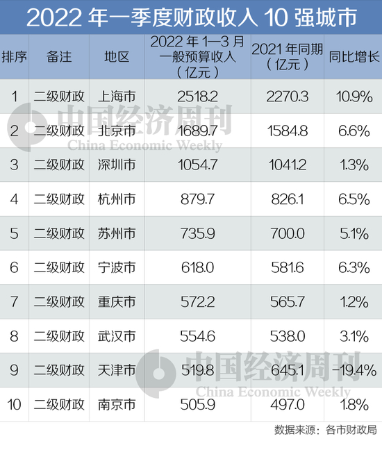 2022年第一季度全国主要城市财政收入已经出炉,《中国经济周刊》记者梳理发现,排名前10的城市分别是:上海、北京、深圳、杭州、苏州、宁波、重庆、武汉、天津和南京。这一排名跟2021年同期相比并未发生变化。