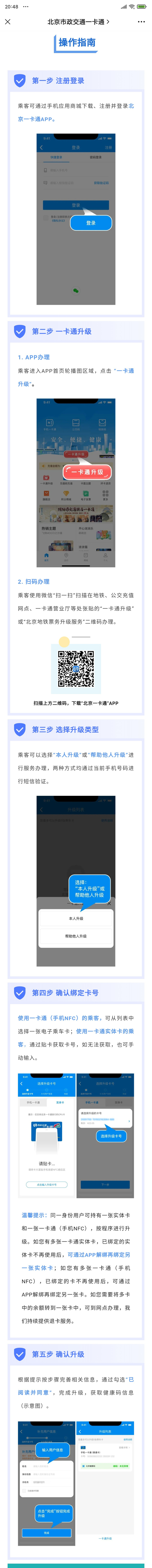 从 5 月 17 日起,用户可通过“北京一卡通”App 办理,或使用微信“扫一扫”扫描在地铁、公交充值网点、一卡通营业厅等处张贴的“一卡通升级”或“北京地铁票务升级服务”二维码办理。用户补充完善相关信息完成升级后,在刷卡或刷码乘车支付时可同时关联健康码。对不同类型的一卡通实体卡、非实体卡,请参照以下渠道办理:
