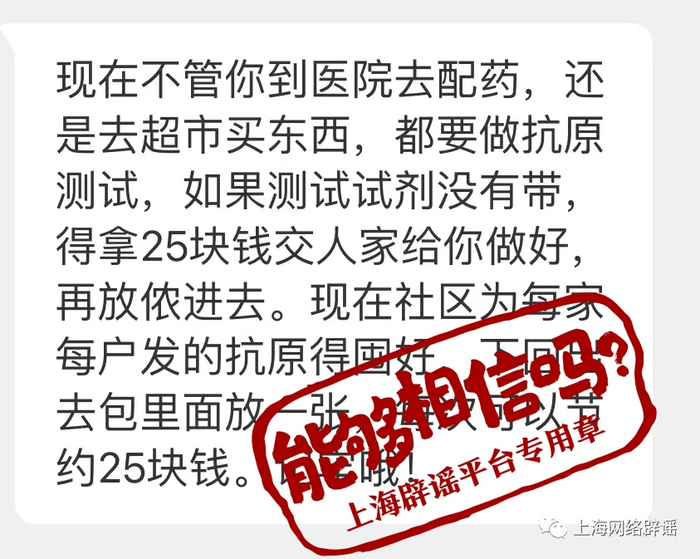 近日,上海辟谣平台接到不少留言,询问圈群中的一条提醒是否属实。该提醒称“现在不管你到医院去配药,还是去超市买东西,都要做抗原测试。如果测试试剂没有带,得拿25块钱交人家给你做好,再放侬(你)进去。现在社区为每家每户发的抗原得囤好,下回出去包里放一张,每次可以节约25块钱。”