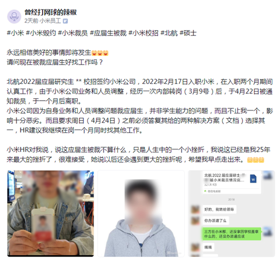 前述网友还称,“小米公司因为自身业务和人员调整问题裁应届生,并非学生能力问题,而且不只我一个,影响十分恶劣。”