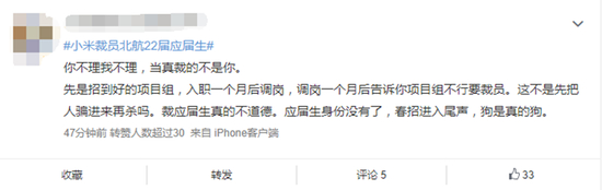 在#小米裁员北航22届应届生#以及#北航应届生自爆被小米裁员#等微博话题中,大量网友声援该毕业生。有网友谴责小米“先是招到好的项目组,入职一个月后调岗,调岗一个月后告诉你项目组不行要裁员。这不是把人骗进来再杀吗。裁应届生真的不道德。”还有网友质疑小米,“招人的时候就没点规划?”