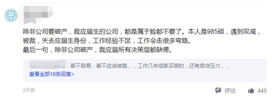 一网友评论称,“除非公司破产,裁应届生的公司,都是属于脸都不要了。”其还表示自己也是985硕士,受“双减”影响被裁,失去应届生身份,工作经验不足,工作会走很多弯路。发言最后,其再次强调“除非公司破产,裁应届生的所有决策层都缺德。”语气犀利之程度可见其愤怒。