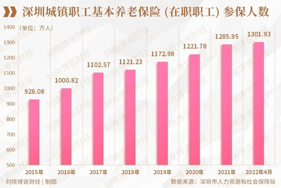 根据深圳人社局的最新数据,截至2022年4月末,深圳城镇职工基本养老保险的在职职工参保人数,达到了1301.93万人,比2021年末增加了16万人(上图)。