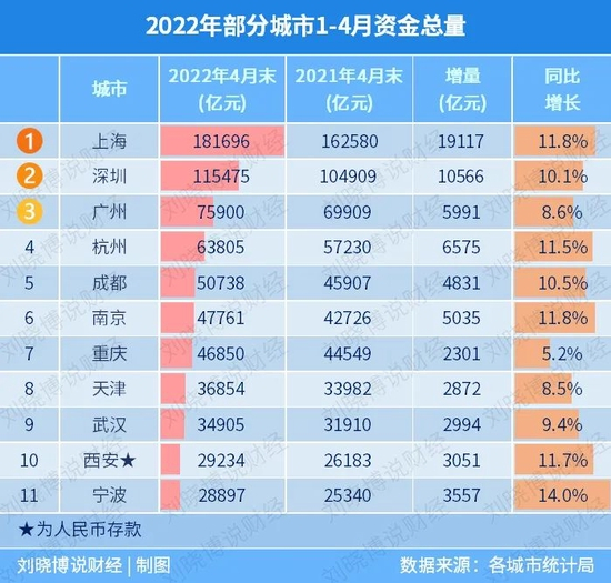 上图是截至2022年4月末,主要城市的资金总量,也就是金融机构本外币存款余额(部分城市尚未公布数据)。这是一个重要性堪比GDP的指标,可以更客观地反映城市经济的活跃度,以及对资金的吸引力。