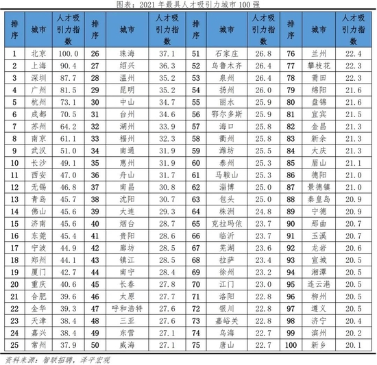 近日,智联招聘与泽平宏观联合发布的《中国城市人才吸引力排名》显示, 中国最具人才吸引力城市100强中,北京、上海、深圳位居前三,深圳位次比去年再进一位。(下图)