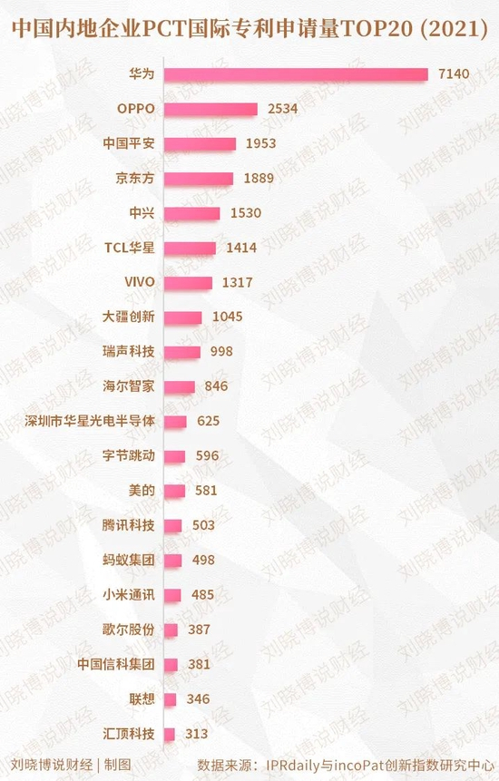 上图是中国内地企业2021年PCT专利申请的20强,超过三分之一是总部位于深圳,或者即将迁入深圳的企业。