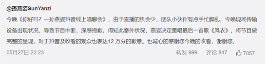 反观抖音平台的孙燕姿唱聊会,从突兀的开场到戛然而止的结尾都像一个仓促上马的项目。当晚孙燕姿在演唱告别曲《风衣》时直播突然中止,一段时间后,直播画面重现,结束之后,其团队发布微博致歉,称“因为现场传输设备出现状况,导致节目中断”。