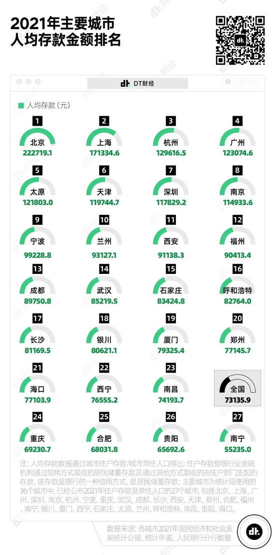 其次是广州、太原、天津、深圳、南京,人均存款都超过了10万元。