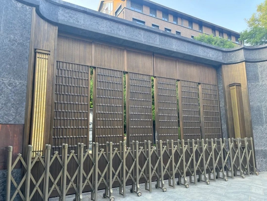 多数情况下,人们窥探不到任何有关万柳书院的细节,除了在南门——万柳书院正门短暂开启的时候。这扇纯铜质的青铜大门有4.8米高,合扇长度12米,平时只开最右侧的一小扇供业主通过,透过合扇的缝隙,能看到小孩在院内嬉笑打闹。这里的保安几乎能认出每一位业主,远远看到一个骑着山地自行车的男人靠近,保安给他开了门,“您回来了啊”,男人“诶”了一声,人不用下车,自行车转个弯进门,就再不见踪影。一对夫妻提着菜进去,保安对他们点了点头,身影消失在门口后,这扇唯一开启的门再度紧闭。