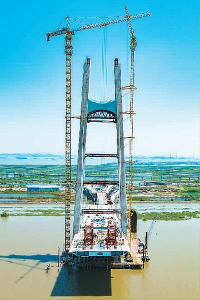 作为南沙自贸区重点交通基础设施项目,位于广州市南沙区万顷沙的红莲大桥建成后将辐射带动广东全省形成更加高效便捷的现代交通运输体系。图为正在建设中的红莲大桥。魏劲松摄(人民视觉)