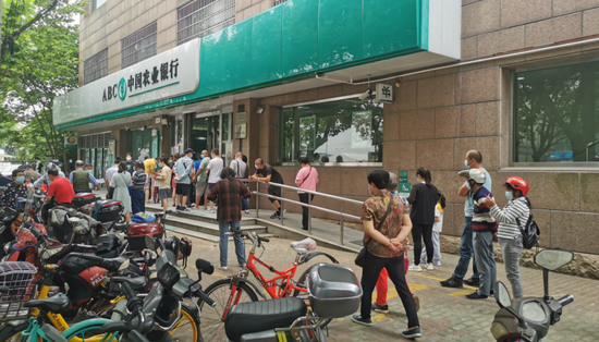 上海市中心银行网点6月1日全面复工。在一家银行门口,前来办理业务的人排起了长龙。