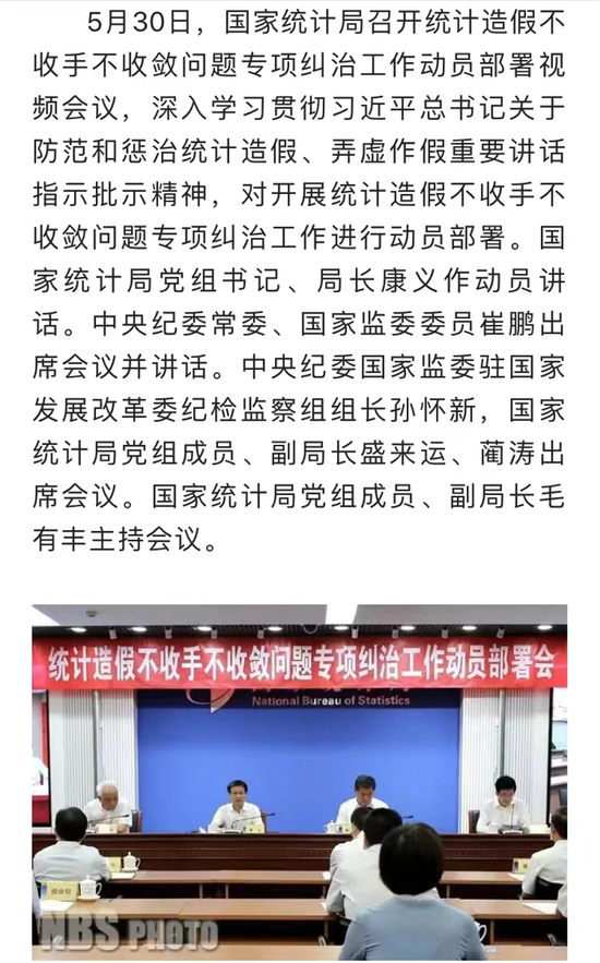 法治网研究院还注意到,就在中央纪委国家监委官网发布张敬华被“双开”消息的前一天,5月30日,国家统计局还召开了统计造假不收手不收敛问题专项纠治工作动员部署视频会议。