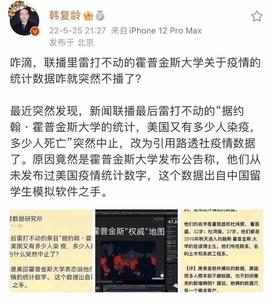 近日,网上流传一种说法称,《新闻联播》已经不再引用美国约翰斯·霍普金斯大学的美国疫情统计数据,原因是约翰斯霍普金斯大学发布公告称其从未发布过疫情统计数据,而《新闻联播》中引用的统计数据皆出自中国留学生的模拟软件之手。