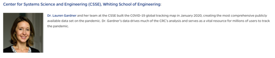 约翰斯·霍普金斯大学疫情统计数据网站介绍,目前该网站由约翰斯·霍普金斯大学新冠资源中心(The Johns Hopkins Coronavirus Resource)运营。该中心目前有6位负责人,分别来自彭博公共卫生学院(Bloomberg School of Public Health)、医学院、公民影响中心(Centers for Civic Impact),以及怀挺工程学院(Whiting School of Engineering)。其中,以下这位名为劳伦·加德纳的工学教授同她的团队早在2020年1月就创建了新冠全球追踪地图。“加德纳博士的数据驱动了新冠资源中心的分析。”