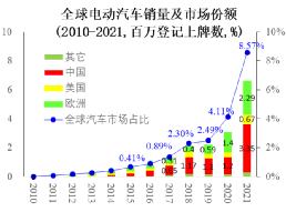 另外作为当代能源转型的一个重要部门应用场景,近年主要汽车生产国的新能源汽车进入快速普及时期,全球新能源汽车市场出现井喷式增长。上面右图数据显示,近年我国电动汽车制造和消费增长速度处于领先水平,2021年我国电动汽车销量335万辆,超过全球660万辆总量的一半。