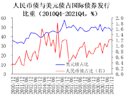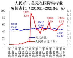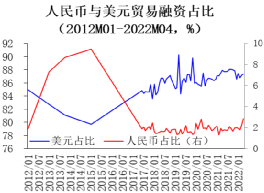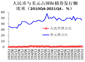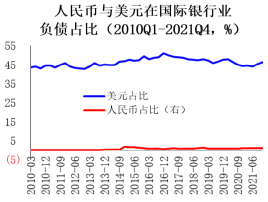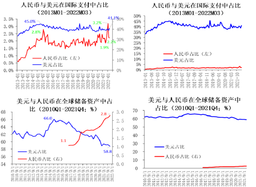 下面几组图形分别报告人民币在贸易融资、国际银行存款、国际债券融资、广泛国际支付和储备资产持有等方面情况,以便具体定量观察人民币国际化推进状态。每个指标左边图形用左右轴分别表示中美相关指标,以便更清晰观察两国货币特别是人民币特定场合国际使用程度变化情况;右图用左轴同时表示两种货币指标,便于直观把握二者相对差距。不同指标表现不同,具体观察结果取决于用什么指标以及选择哪个起始年份。比较2017年初与最近情况,绝大部分指标都出现不同程度提升。其中人民币在全球外汇储备占比的增长表现最为引人注目,从2017年初的1.1%上升到2021年4季度2.8%。人民币在国际银行业存款负债、国际支付及国际债券发行占比等指标,也在波动中显著增长。人民币贸易融资占比过去五年多大体在2%上下波动。上述信息显示,近年人民币国际化仍在逐步推进,近年美国遏制政策也未能改变相关趋势。
