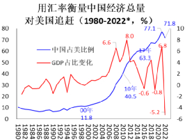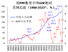 其次用同一种货币衡量两国经济体量并更直观考察我国经济追赶情况,货币转换采用市场汇率和购买力平价两种方法。下面左图形数据提示用汇率衡量美元GDP同样持续追赶,不过追赶速度波动幅度明显增加,平均追赶速度也显著放缓。例如2017-2022年我国经济总量相对美国占比从63.3%增长到71.8%,共提升8.5个百分点,年均1.7个百分点,低于新世纪最初十年近3个百分点和2010-2017年均3.3个百分点。由相关定义可知,这个指标追赶动态放缓原因包括上面讨论的两国用本币表示的实际增速追赶趋缓,两国GDP平减指数相对变化,人民币兑美元汇率波动和升值趋势放缓等因素。