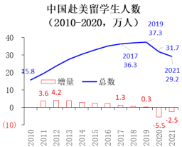 投资、旅游、留学等双边交往情况差异较大。在直接投资方面,进入新世纪以后我对美投资十几年趋势性增长,下面左图数据显示从2005年投资额2.5亿美元一路增长到2016年的近170亿美元。此后受到国内相关政策影响,加上美国投资限制政策作用,我国到美国直接投资大幅回落,2019年降到38.1亿美元,甚至略低于2012年40.5亿美元。美国对我国投资在金融危机前后出现很大波动,晚近时期波动幅度减少,从2017年79.4亿美元,下降到2018年63.9亿美元,随后两年逐步增长到2020年达到93.3亿美元,与我国对美国直接投资比较相对平稳。