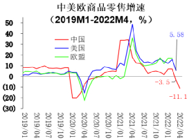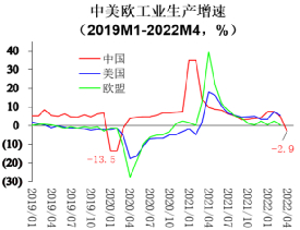 从短期宏观形势看,由于疫情防控方针与宏观调控政策不同,近年中美宏观经济呈现罕见周期错位的“镜像关系”特点。受新冠疫情冲击影响,特别是由于宏观政策刺激规模和力度过大,美国经济去年年中以来通胀压力快速增加,目前美国加大紧缩政策力度应对几十年前所未有通胀,某种形态的滞涨前景成为其中期经济预测的现实风险。我国受疫情间歇性冲击与其它因素影响,去年下半年以来经济增速较快回落,年底中央经济工作会议罕见提出经济运行面临“需求收缩、供给冲击、预期转弱”组合困难。随着去年4季度稳增长政策发力,今年1-2月经济形势有所好转,然而3月以来多地局部疫情再次加剧,加上俄乌冲突等外部因素影响,经济增长出现新痛点并导致下行压力进一步加大。下图中我国工业生产和商品零售增速月度数据,显示反映短期经济走势的重要月度指标近来快速回落,3-4月继2020年初疫情大流行初期之后再次下降到负值区间;4月同比增速分别为-2.9%和-11.1%,较大幅度低于美国近期水平。
