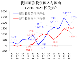 我们尚未获得中美双边证券投资的时间序列数据,姑且观察我国证券投资整体流入和流出数据。随着我国资本账户逐步扩大开放以及国内外汇管制松绑,通过不同时期建立的QFII、QDII、深港通和沪港通等管道机制及其后续扩容,我国证券投资总体呈现扩大趋势。红线表示的外国对我国证券投资流入(即“证券投资净负债产生”)经历两次多年上升和两次短期下降:第一次上升是2010年从316.8亿美元上升2014年932.4亿美元,2015年大幅回落到67.4亿美元。第二次持续多年上升达到2021年2567.7亿美元,去年再次显著下降到1767亿美元。与第一次下降由于外国对国内债券和股票投资同时下降不同,去年回落主要由于外国对国内债券规模较大幅度减持所致。红线表示的我国对外国证券投资流出(证券投资资产净获得)过去十余年也呈现趋势性增长,金融危机后我国对外证券投资流出一度出现负增长,直到2014年回升达到108亿美元,2016年飙升到超过1000亿美元。2016-2021年又经历一轮下降-飙升-回落的波动。可见证券投资总的态势是双向流动趋势性增长,尤其是外资流入增长趋势更突出,提示我国经济发展基本面条件对外国证券投资者吸引力增长。不过证券投资也存在较大波动,特别是去年以来流入投资较大幅度回落,显示外资对中国经济前景预期仍有待加强。