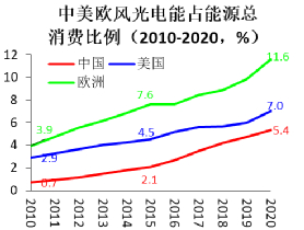 当然也要看到,由于我国人口规模数倍于美国和欧洲[2],目前人均风光发电量仍显著低于美欧。另外我国初级能源消费总量较大幅度超过美国和欧洲,因而我国风光能源占初级能源消费比重仍然不同程度低于美欧(下面左图)。