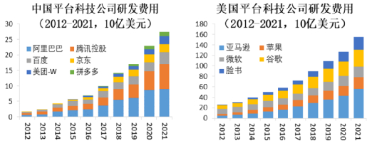 下图分别报告我国与美国头部互联网平台公司的研发费用,显示我国六家头部互联网研发支出仍保持快速增长,中美关系变化以及国内相关监管政策调整环境下这一趋势并未逆转。不过数据同时显示,与美国类似企业群体比较,我国上述指标仍有4-5倍差距;加上美国前沿科技产业创新历史较长的累积效果,兼有基础科学、前沿创新、资本市场较强组合优势,决定了我们在高科技前沿创新领域整体水平赶超美国或仍需较长时期努力。早先我国企业密切关注美国前沿创新动向,结合国内现实条件第一时间借鉴和模仿创新,并在动态学习和迭代过程中积累经验推陈出新形成局部特色和优势,从而逐步从跟跑提升为并跑甚至个别场合领跑。上述追赶创新方式目前在不少场合可能仍有现实合理性,从一个侧面凸显加强交流和扩大开放的重要性。