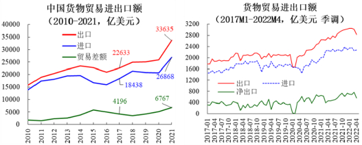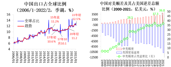 随着本世纪以来我国开放经济超预期成长,我国出口占全球比例趋势性上升,从2006年大约6%增长到2015年底的11.2%,并在随后几年回落调整2017年10月10.1%。不过该指标近年趋势性回升,2020年初恢复到历史高位,过去两年多进一步上升并于2022年初达到12.5%历史新高。特朗普政府贸易战直接目的之一是遏制我国出口增长,上述情况显示该政策虽或在2018年前后产生短期效果,从过去五年前后整体形势看我国外贸以及全球占比仍在显著增长,美国上述目标未能得逞。