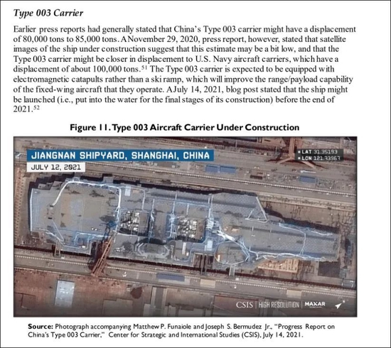 报告中,美国方面认为,此前媒体推测中国的“003”型航母排水量可能在8万吨到8.5万吨之间。最新的商业卫星图像表明,美国方面低估了003型航母的排水量,003型航母可能更接近美国海军航母的排水量,排水量接近10万吨。003型航母预计将配备电磁弹射器,这将提高其搭载的固定翼飞机的射程/有效载荷能力。